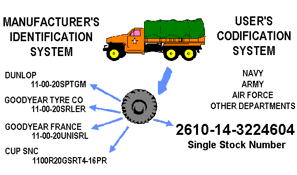 Ziffern 1-4 sind der NATO Supply Classification (NSC) Code, der eine Verbindung zwischen der Position und der Gruppe bzw. Klasse ähnlicher Elemente herstellt.