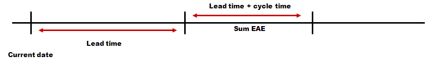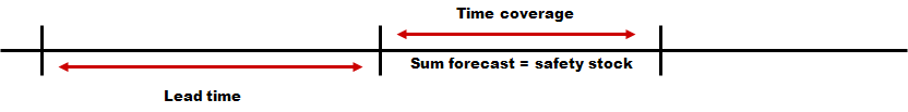 Diese Methode ist eine ähnliche Funktion wie die Historische Unbestimmtheit mit dem wichtigen Unterschied, dass die Standardableitung innerhalb der Vorlaufzeit von der Prognose in der Bedarfsplanung abgerufen wird und zusammen mit den Servicegrad zur Berechnung des Sicherheitsbestands verwendet wird. Der Servicegrad ist der Bedarf, den Sie für ein Service Level im Lebenszyklus des Artikels haben, die Standardableitung gibt die Abweichung des Bedarfs während der Vorlaufzeit an. Die Standardableitung wird vom MSE-Fehler für die Vorlaufzeit (plus eventueller Zykluszeit) aus der Bedarfsplanung berechnet. Die Berechnung erfolgt eine Vorlaufzeit in die Zukunft (siehe Abbildung).