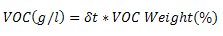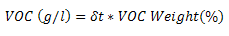 Der VOC (g/l) wird als 100 berechnet - Zusammenfassung des Gewichtsanteils (%) aller Festkörper, nicht flüchtigen organischen Lösungsmittel und Wassersubstanzen vom Aufschlüsselungsergebnis pro Substanz und der theoretischen Dichtheit für den übergeordneten Artikel.