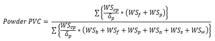 Die Pulverpigment-Volumenkonzentration (Pulver-PVC) wird berechnet als: Volumen der Füllstoffe und Pigmente geteilt durch das Volumen aller Substanztyp.