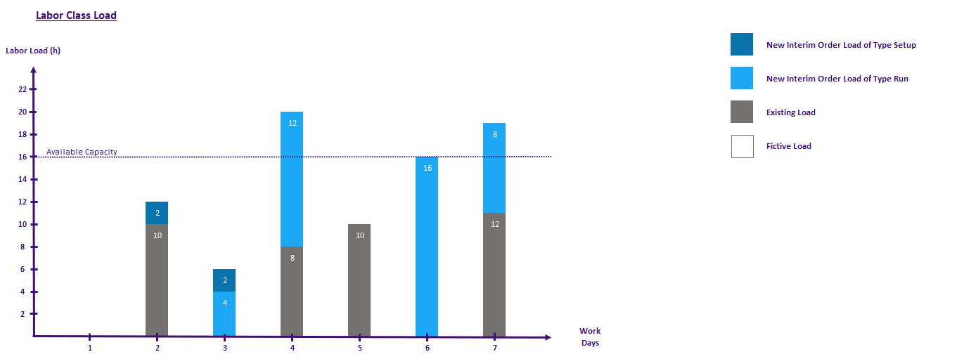 The charts below visualize how work center load is created and scheduled during backwards scheduling from the Scheduled Finish Date at 5:00 PM day 7. Since Finite Capacity only is enabled for the work center, the scheduling is performed according to the remaining work center capacity for each day after subtracting already existing load. Remaining labor class capacity is not considered. The fictive load in the work center load graph illustrates how the already existing overload at day 5 is fictively distributed to an earlier working day, to avoid that the total load gets bigger than the total available capacity during the scheduled period of the interim order operation. If forwards scheduling would have been performed, the existing overload at day 5 would have been fictively distributed to a later working day instead of an earlier. The result of the backwards scheduling is that the Scheduled Start Date of the operation is set to 4:00 PM at day 2. The preceding interim order operation will get a Scheduled Finish Date set to 4:00 PM at day 2, or earlier.