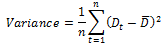 差異は品目の需要パターンの変動を表します。需要の変動が大きい項目は通常、予測が難しく、特別な注意が必要になる場合があります。この式は最新の履歴期間から実行され、予測誤差期間で指定された期間数だけ遡って計算されます (n = 予測誤差期間)。(一般的なサーバー データの入力を参照)