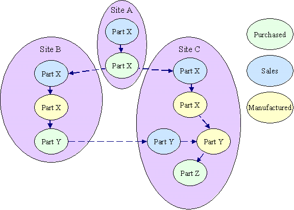 複数サイト計画機能は、複数のサイトを内部サプライ チェーンとしてまとめて計画します。内部需要サプライ チェーンの実行は、サイト間オーダーの合理化された形式である社内間オーダーを通じて処理されます。複数サイト品目構成は、単一サイトの品目表 (BOM) の計画機能を拡張し、複数サイト計画に必要な情報を提供します。サイトと別の内部仕入先サイト間で配布される品目の仕入先品目レコードによって、接続が定義されます。複数サイト計画接続は、仕入先別購買品目で定義されます。